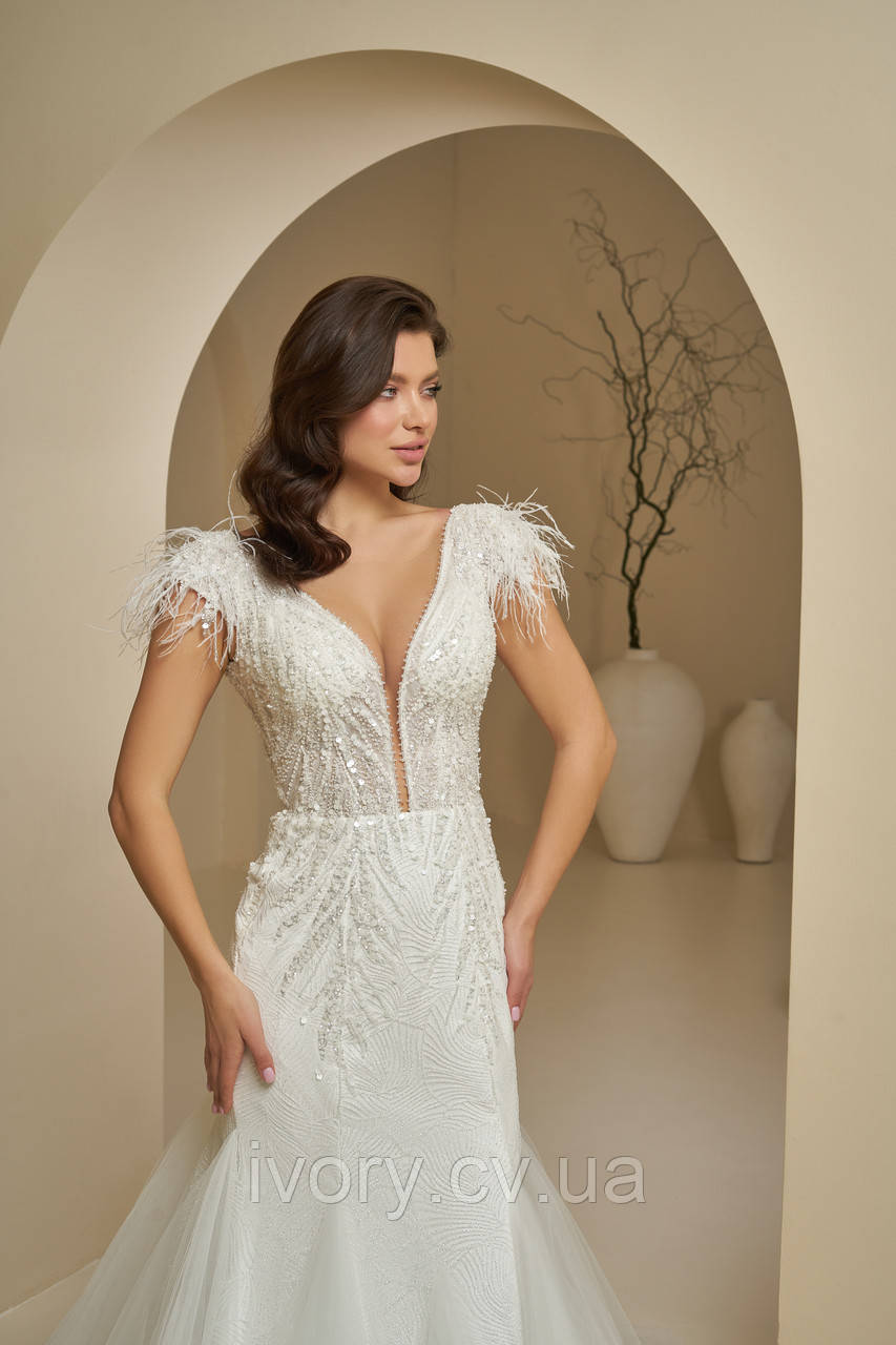 Сюзанна - це казкова весільна сукня з ніжної тканини та сяючого декору. Корсет з V-подібним вирізом повністю прикрашений бісером та поєтками. Спідниця прикрашена паєткамии і вставками з фатину.